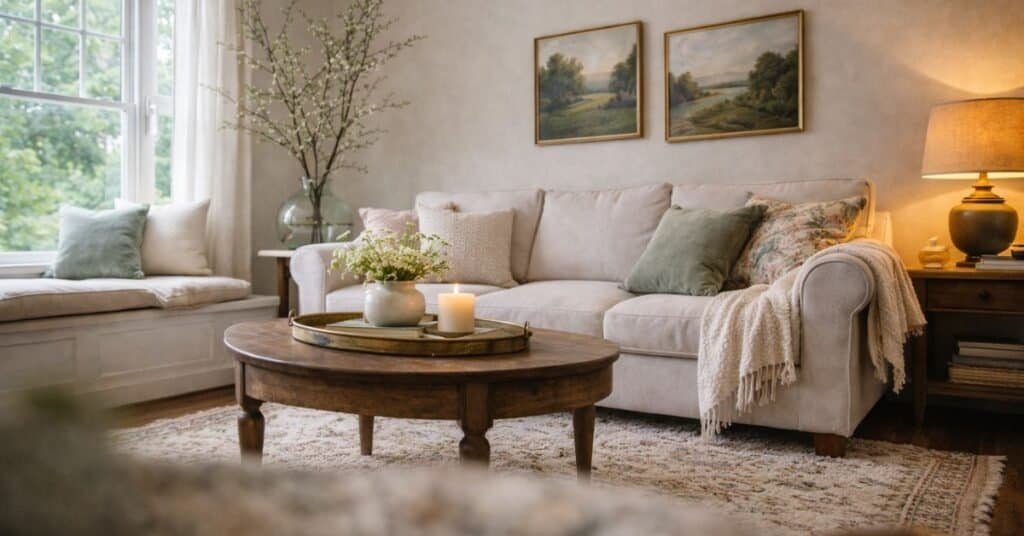 Swap one heavy throw for a lighter knit, switch pillow covers to softer tones, and clear the coffee table down to three items. Add one tall stem arrangement near the window to pull light upward. These small changes read as spring without needing a full room redo.