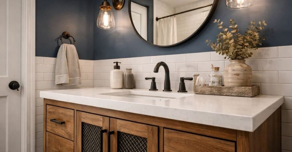This one works when you want a bathroom that feels planned, but not busy. Tonal and two tone paint gives structure to a small space and helps the room feel calmer.