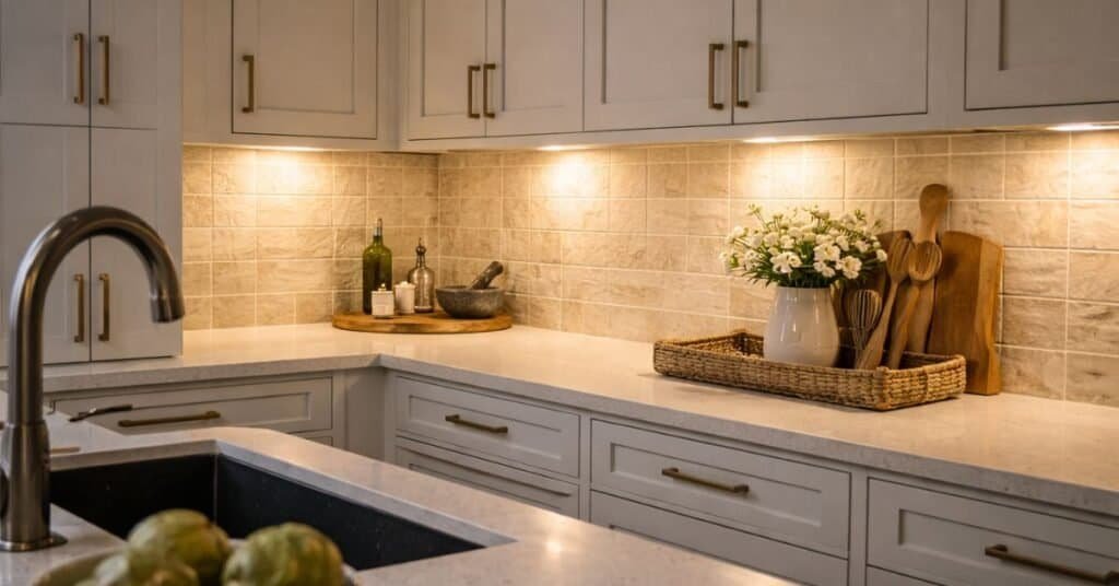 Under cabinet lighting makes counters look smoother and warmer. It also helps you cook without harsh overhead glare.