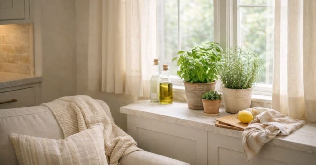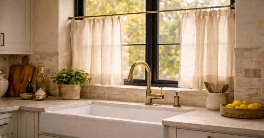 Cafe curtains, woven shades, or soft linen panels add warmth without blocking light.