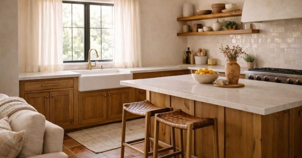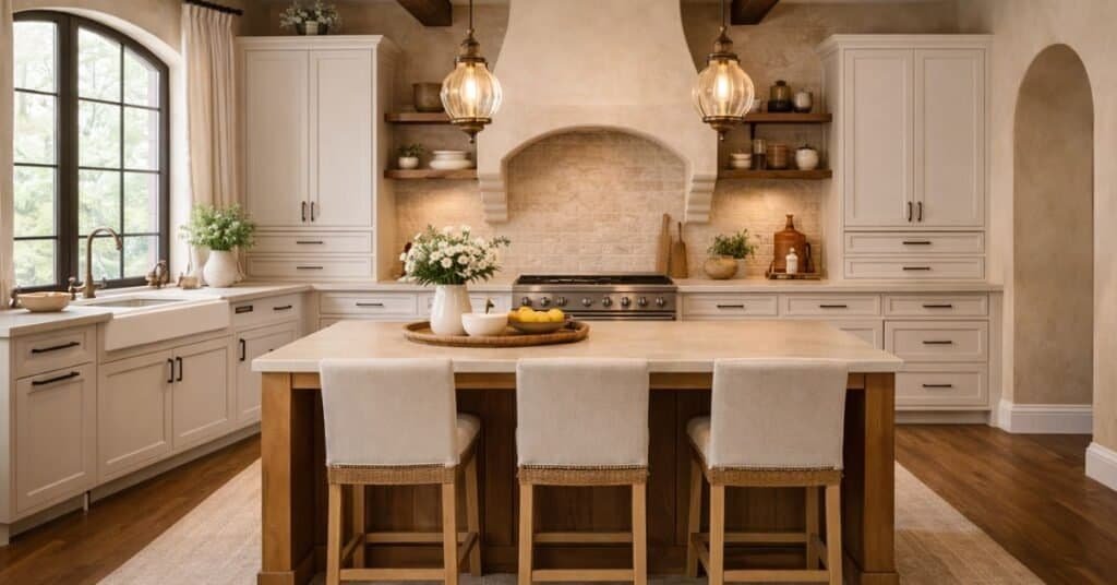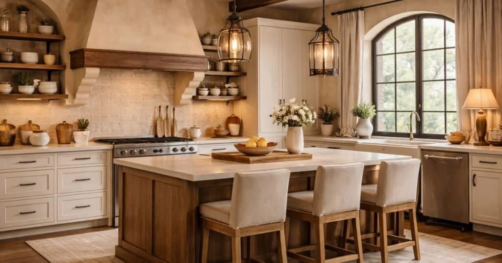 Use three types of light: overhead for general light, task lighting for counters, and one softer light for mood. Pendants over the island plus under cabinet lighting works well, and a small lamp in a nook makes evenings feel warmer. Keeping bulbs warm toned helps the whole kitchen feel softer.