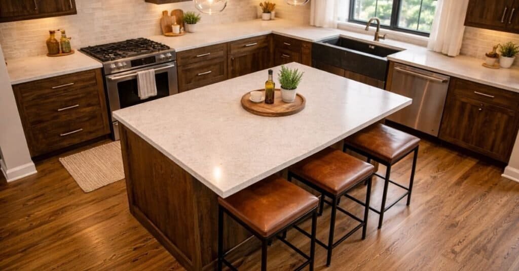 Two stools and one small tray zone can make it feel more welcoming without clutter. If you want a simple method, use triangle setup for a tidy island. The Triangle Setup That Keeps It Tidy.