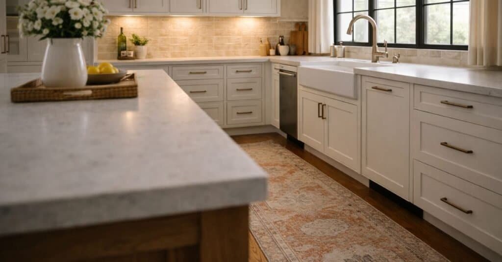 Use one or two larger textiles instead of lots of small ones. A runner rug and cafe curtains can soften hard surfaces without adding extra objects on counters. Homes and Gardens points out rugs and window treatments are quick ways to add coziness.