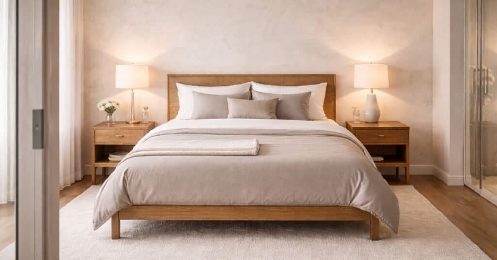 There is space to breathe. The bed is the star. The lighting is warm and gentle, not bright and flat. That is the real difference between a normal bedroom and a hotel style bedroom.