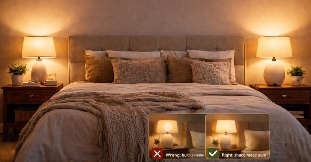 - if the bulb is visible, raise the lamp, swap the shade, or move the lamp slightly back on the nightstand