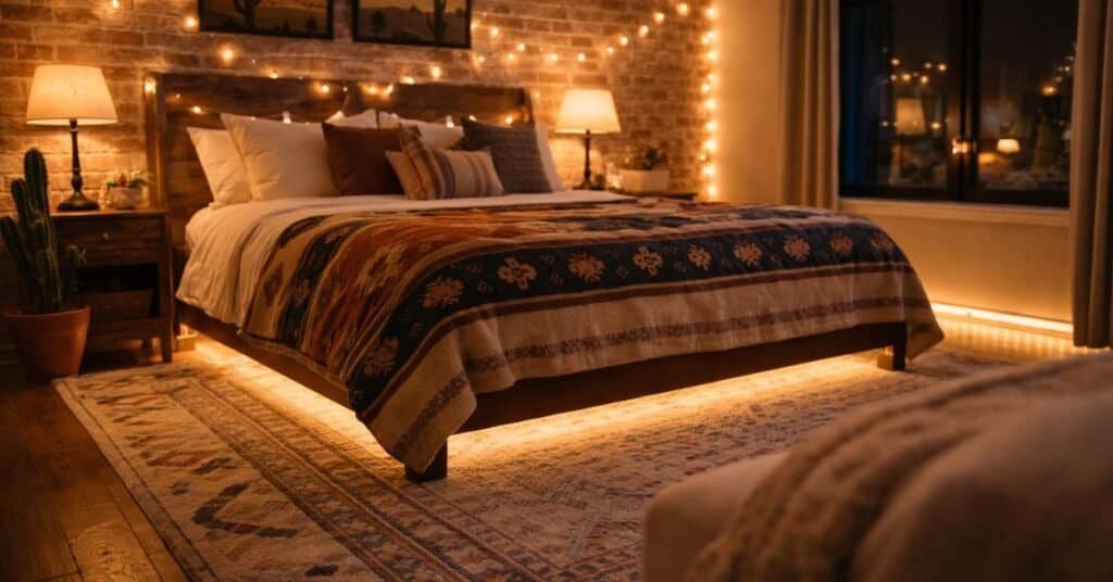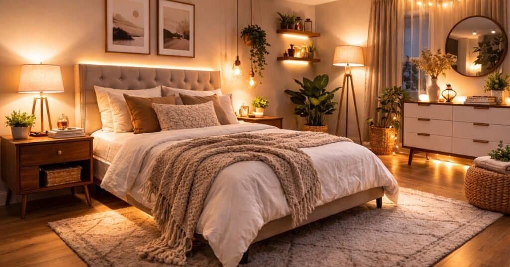 This is where learning how to decorate bedroom with lights gets fun. You do not need expensive fixtures to make a bedroom feel cozy and modern. You just need a few smart light placements that create a soft warm glow, like little lighting zones instead of one big spotlight.