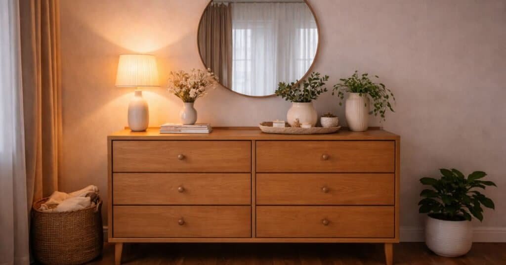 Small space variation: if you cannot hang a mirror, lean a mirror safely on a dresser and keep the top clear so it does not look crowded.