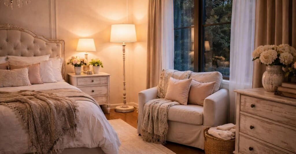 A common mistake is aiming a bright floor lamp right at the bed. It creates glare and makes the room feel harsh again.