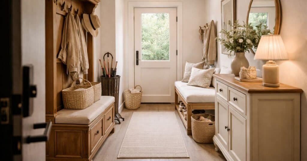 In the next sections, you will see small entryway ideas that keep the walkway clear, give shoes and bags a real place, and still look clean and calm.