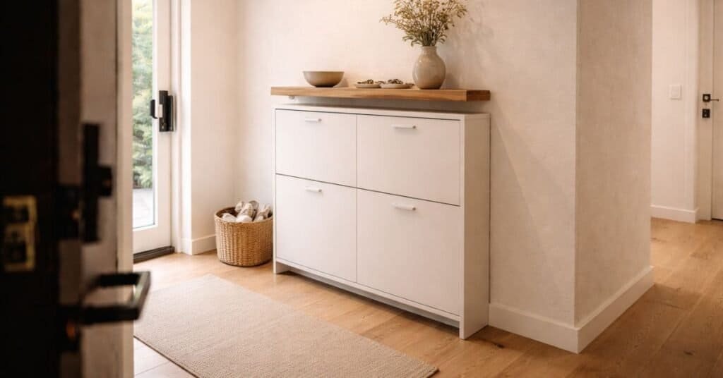 Shoes work best when they stay low and contained. A shoe tray or slim closed cabinet keeps them tidy without blocking movement. Avoid tall racks that draw attention and crowd the space.