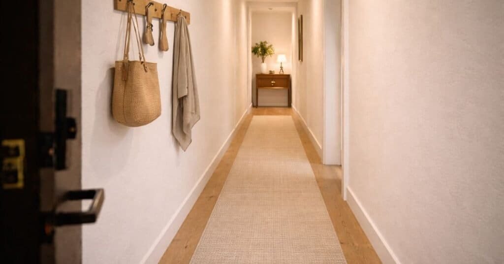 A runner works better than a small mat. It should leave a small border of floor on each side and run in the same direction as the walkway. This helps the space feel longer.